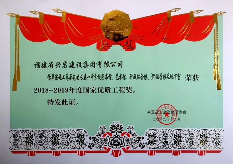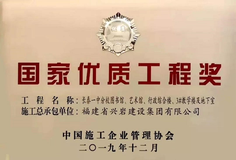 中國施工企業管理協會于12月8日在北京召開2019年國家優質工程獎總結表彰大會。福建省興巖建設集團施工總承包的“長泰一中分校圖書館、藝術館、行政綜合樓、3#教學樓及地下室”榮獲國家優質工程獎。這是該項目獲“水仙杯”優質工程獎、福建省建筑施工安全生產標準化優良項目、“閩江杯”優質工程獎、“華東片區優質樣板工程”等榮譽之后再獲國家級質量獎,也是我市首個、我縣唯一的獲國優獎項目。興巖集團董事長葉小清參加了頒獎儀式。