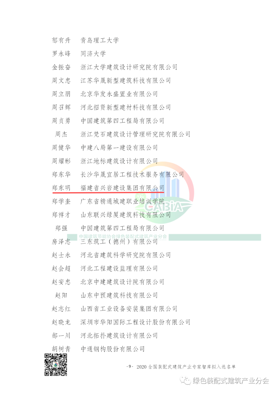 為加快有序推進(jìn)國(guó)內(nèi)裝配式建筑發(fā)展,充分發(fā)揮專家專業(yè)特長(zhǎng)、技術(shù)服務(wù)、咨詢指導(dǎo)、智力支持等作用,中國(guó)建筑節(jié)能協(xié)會(huì)綠色裝配式建筑產(chǎn)業(yè)分會(huì)于近日印發(fā)《關(guān)于2020全國(guó)裝配式建筑產(chǎn)業(yè)專家智庫擬入選人員名單的公示》(國(guó)建綠筑〔2020〕8號(hào))。興巖集團(tuán)鄭東明、陳海彬、林江鵬、陳少敏4人入選2020全國(guó)裝配式建筑產(chǎn)業(yè)專家!