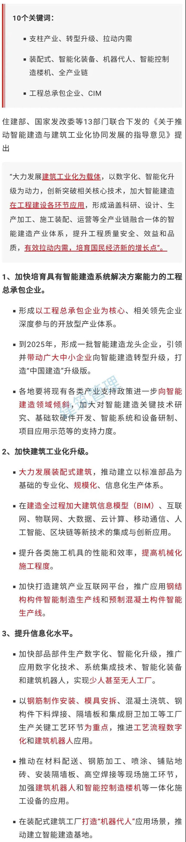 立足當前,著眼長遠。準確把握新一輪科技革命和產業變革趨勢,加強戰略謀劃和前瞻部署,引導各類要素有效聚集,加快推進建筑業轉型升級和提質增效,全面提升智能建造水平。