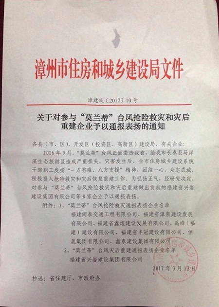 日前,漳州市住房和城鄉(xiāng)建設局對參與“莫蘭蒂”臺風搶險救災和災后重建做出貢獻的福建省興巖建設集團有限公司等8家企業(yè)予以通報表揚!!
