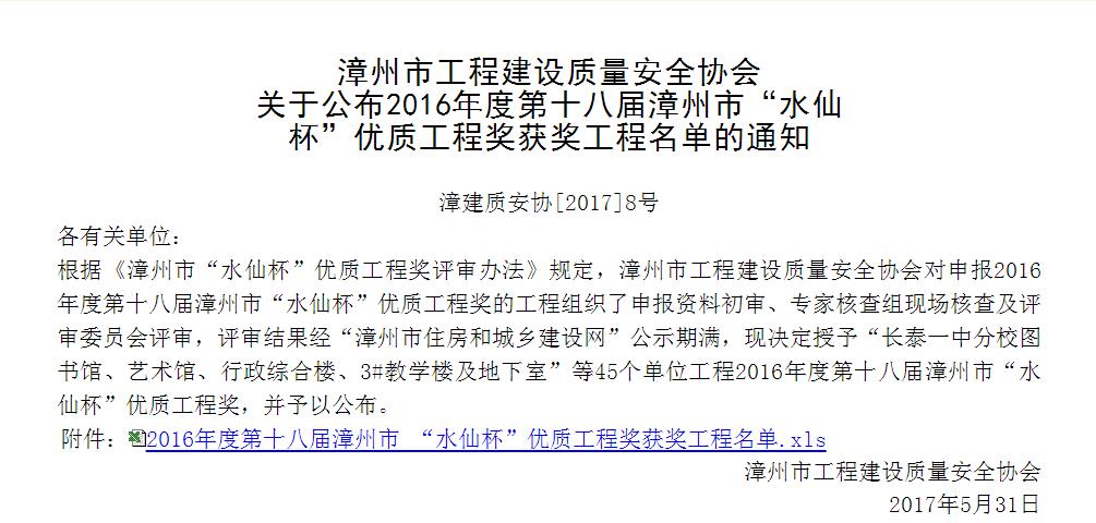 日前,漳州市工程建設質量安全協會根據《漳州市“水仙杯”優質工程獎評審辦法》規定,對申報2016年度第十八屆漳州市“水仙杯”優質工程獎的工程組織了申報資料初審、專家核查組現場核查及評審委員會評審并經公示期滿,由我集團承建的“長泰一中分校圖書館、藝術館、行政綜合樓、3#教學樓及地下室”工程項目榮獲2016年度第十八屆漳州市“水仙杯”優質工程獎。